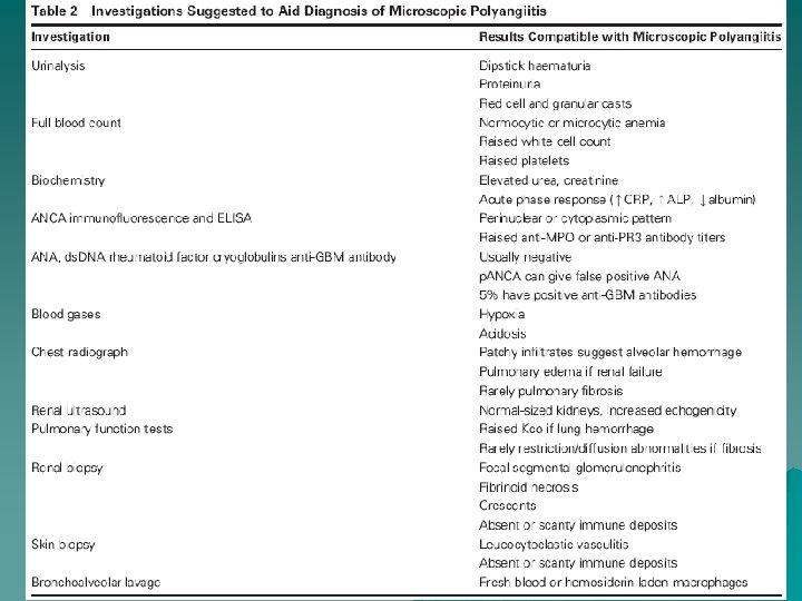POLIANGEITIS MICROSCÓPICA Características clínicas: Compromiso dérmico: Un rash purpúrico es mirado en 30% en el momento del diagnóstico. Bx. piel vasculitis leucocitoclastico necrotizante Compromiso Neurológico: Es visto hasta en un 30% y la mayoría se presenta con Mononeuritis múltiple. Compromiso Ocular: Epiescleritis hasta un 20%, otros: uveítis, vasculitis retinal. Compromiso Gastrointestinal: Se observa en 30 – 40%: dolor abdominal. Diarrea, sangrado GI