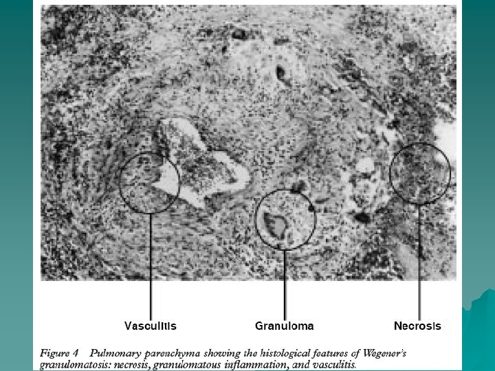 GRANULOMATOSIS WEGENER Es el más común de las vasculitis granulomatosas pulmonares, típicamente involucra: El tracto respiratorio alto (senos paranasales, oído, nasofaringe, orofaringe, traquea), El tracto respiratorio bajo (bronquios y pulmones), y el riñón, con grados variable de vasculitis diseminadas. La característica histológica mayor incluye: vasculitis necrotizante de pequeños vasos (arteriolas, venulas y capilares), necrosis extensa e inflamación granulomatosa.