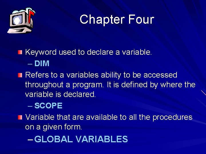 Chapter Four Keyword used to declare a variable. – DIM Refers to a variables ability to be accessed throughout a program. It is defined by where the variable is declared. – SCOPE Variable that are available to all the procedures on a given form. – GLOBAL VARIABLES