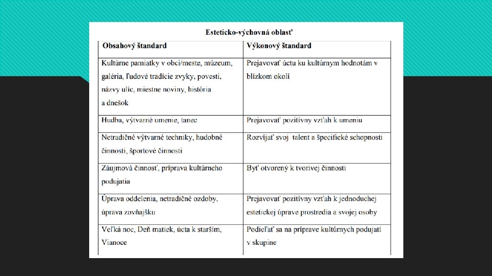 5. Esteticko-výchovná oblasť Posilniť úctu ku kultúrnym hodnotám v blízkom okolí, rozvíjať základy vzťahu k umeniu, rozvíjať talent a špecifické schopnosti, rozvíjať základy tvorivých schopností a zručností, prejavovať pozitívny vzťah k jednoduchej estetickej úprave prostredia, podieľať sa na príprave kultúrnych podujatí v oddelení, objavovať krásu v bežnom živote.