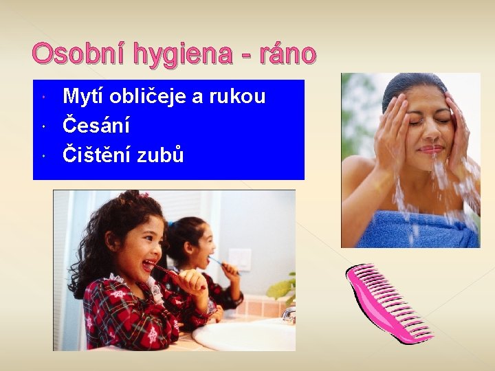 Osobní hygiena - ráno Mytí obličeje a rukou Česání Čištění zubů