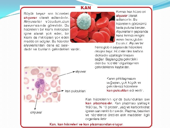 Kanın yapısı incelendiğinde en fazla sayıda görünen kan hücreleri alyuvarlardır. Kırmızı kan hücreleri adıyla da bilinen alyuvarlar, kana kırmızı rengini verir. Hücrelere oksijen götürür ve hücredeki karbondioksiti geri alır. Alyuvarlar, oluşumları sırasında çekirdeklidir, olgunlaşmalarıyla birlikte çekirdeklerini kaybeder. Çekirdeklerini daha fazla oksijen taşıyabilmek için kaybederler.