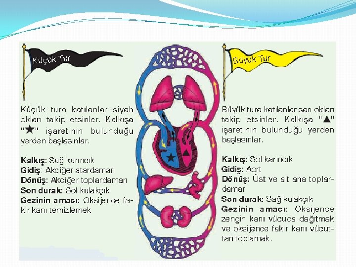 Temiz kanın tüm vücutta geçirdiği yolculuğa büyük dolaşım, temizlenmek üzere kanın akciğerlere yaptığı yolculuğa ise küçük dolaşım denir.
