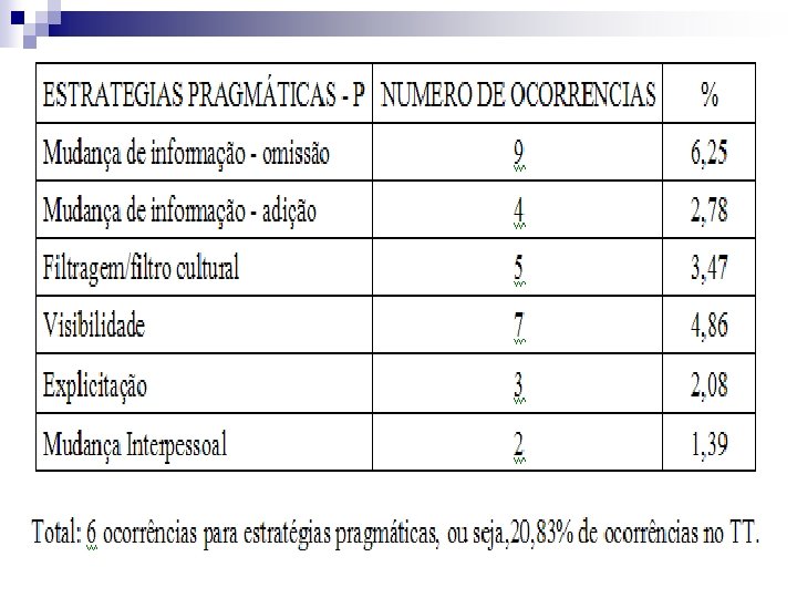 • Esta tabela traz, como exemplo, o tratamento estatístico da estratégia pragmática, representada pela letra “P”. • Dentro desse grande grupo “P”, o item “mudança de informação por omissão” tem 9 ocorrências (6% da tradução), provavelmente em razão do público leitor-final já dominar os conceitos omitidos , não havendo, portanto, a necessidade de mantê-los no TT. • As seis ocorrências de “P” juntas, determinam 20% da tradução. • Esse tipo de análise oferece ao tradutor uma visão bastante concreta das mudanças ocorridas ao longo do processo tradutório.