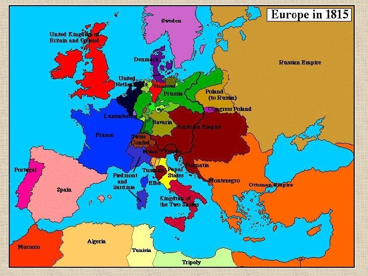 • Po napoleonských válkách vzrostl význam Ruska a Rakouska • Zisky: • Rusko- získalo část Polska (včetně Varšavy) • Prusko – získalo část Saska a část německého území • Švédsko- získalo Norsko