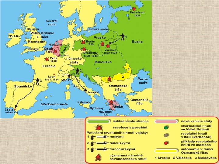 • 1822 povstali Řekové proti útisku osmanské (turecké říše)- franc. brits. ruská pomoc- 1830 - vznik nezávislého Řecka • Polsko od konce 18. stol. neexistovalo jako samostatný stát (rozděleno mezi Rakousko, Prusko a Rusko). V ruské části - 1830 ve Varšavě povstání- potlačeno. Polsko porušťováno a vnucováno pravoslaví. • Itálie- národní hnutí za osvobození a sjednocení Itálie (tajné spolky)