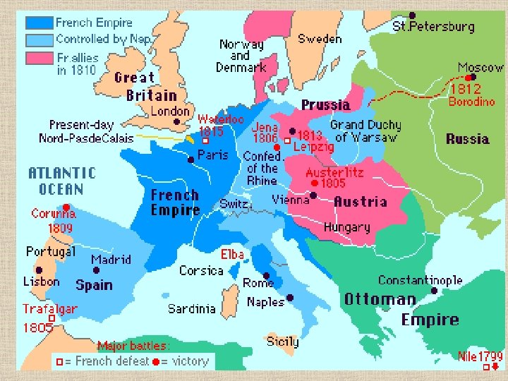 Co předcházelo? • 1792 – 1815= období napoleonských válek, tj. éra mezinárodních intervencí proti revoluční Francii a následně francouzská územní expanze • Napoleon se stal pánem Evropy- nakreslil novou mapu, nové hranice • Trůny rozdával svým bratrům a generálům • 1810 - oženil se s dcerou rakouského císaře Františka I. Marií Luisourakousko-francouzské spojenectví • 2 x udělal chybu: obsadil Španělsko, kde se setkal s celonárodním odporem, partyzánskou válkou • 1812 vpadl do Ruskavýsledek: decimace francouzské armády • Noví rekruti- nezkušení • 1813 - porážka Napoleona v „bitvě národů“ u Lipska • Velká protifrancouzská koalice
