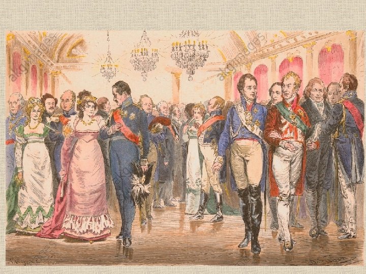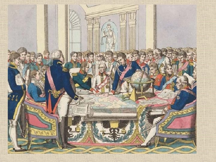 • Vítězové se sešli na summitu ve Vídni a jednali o uspořádání Evropy • 1814 -1815 • Hlavní role: • rakouský císař František I. • Ruský car Alexandr I. • Pruský král, bavorský král, dánský král, würtemberský král • 200 knížat, ministři, generálové, aristokrati • doprovod Alexandr I.