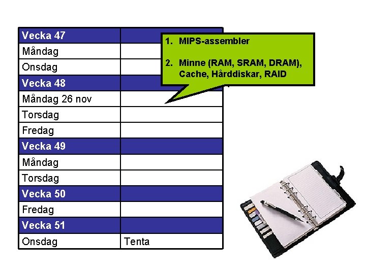 Vecka 47 1. MIPS-assembler Måndag 2. Minne (RAM, SRAM, DRAM), I dag RAID Cache, Hårddiskar, Onsdag Vecka 48 Måndag 26 nov Torsdag Fredag Vecka 49 Måndag Torsdag Vecka 50 Fredag Vecka 51 Onsdag Tenta