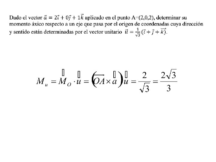 Un sistema de vectores deslizantes tiene como resultante y como momento respecto al origen Determinar para que el punto A(2, 1, 0) sea del eje central y expresar la ecuación del eje central …por tanto, con respecto a los puntos del eje central el momento del sistema es nulo