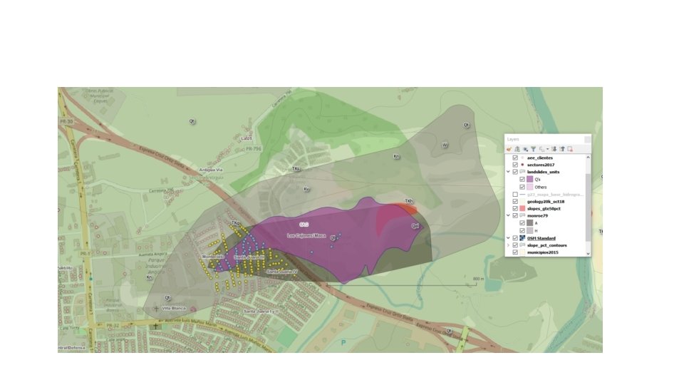 BASIC GIS EXERCISE: LANDSLIDE PRONE GU’S SELECT --Create spatial TABLE for landslide units DROP TABLE IF EXISTS landslides_units; CREATE TABLE landslides_units (id INTEGER PRIMARY KEY AUTOINCREMENT, quad_code text, unit_name text, unit_descript text, pctslope_min double, pctslope_max double, pctslope_mean double); SELECT Add. Geometry. Column('landslides_units', 'geom', 6566, 'MULTIPOLYGON', 'XY'); SELECT Create. Spatial. Index('geom', 'Geometry'); INSERT INTO landslides_units (id, quad_code, unit_name, unit_descript, pctslope_min, pctslope_max, pctslope_mean, geom) SELECT g. rowid , quad_code , unit_name , unit_descript , pctslope_min , pctslope_max , pctslope_mean , g. geom as geom from geology 20 k_oct 18 g where unit_code IN ('Ql', 'Qls', 'Qef', 'Qda') OR geol_id IN ('JU-Qd', 'BR-Qd', 'CL-Qc', 'CY-Qc', 'DE-Qc', 'PO-Qm', 'QU-Qm') OR unit_code LIKE '%-ls%' OR unit_name LIKE '%San Sebas%' OR unit_name LIKE '%Cibao%' OR geol_id = 'CY-TKhv' OR (unit_code LIKE 'Q%' and pctslope_mean >=50) and g. rowid in ( select rowid from spatialindex where f_table_name = 'geology 20 k_oct 18' and search_frame = g. geom) order by unit_code; * Note: some other areas In other words… A multi-criteria selection were removed and others added “manual