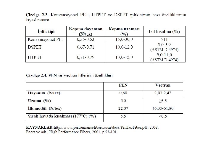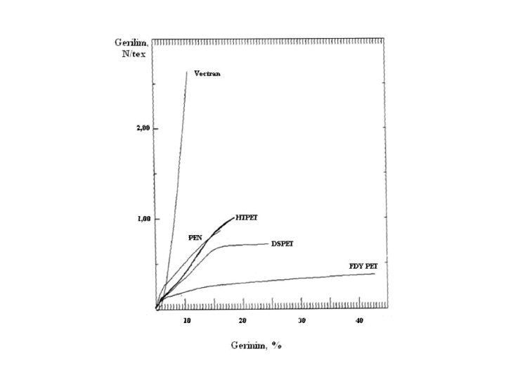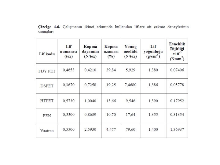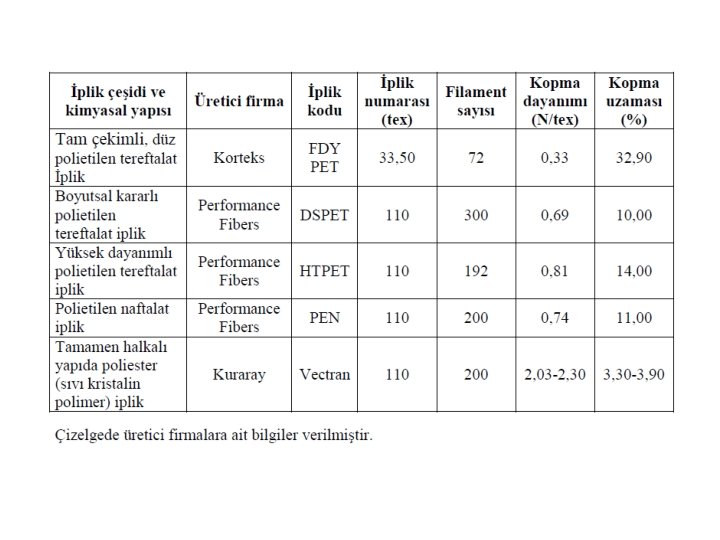 İplik kodu İplik numarası (tex) Kopma dayanımı (N/tex) Kopma dayanımındaki değişim (%) Kopma uzaması (%) FDY PET Ham FDY 10 FDY 15 FDY 20 33, 50 83, 28 86, 83 89, 95 0, 3316 0, 4571 0, 3536 0, 2859 -+37, 85 +6, 634 -13, 78 32, 90 8, 220 8, 154 8, 369 DSPET Ham DSPET 10 DSPET 15 DSPET 20 110, 00 115, 81 119, 97 124, 49 0, 5998 0, 4054 0, 3987 0, 3246 --32, 41 -33, 53 -45, 88 12, 92 8, 740 9, 102 9, 235 HTPET Ham HTPET 10 HTPET 15 HTPET 20 110, 00 115, 54 121, 34 121, 83 0, 7112 0, 5567 0, 4982 0, 4138 --21, 72 -29, 95 -41, 82 13, 830 11, 39 12, 53 12, 47 PEN Ham PEN 10 PEN 15 PEN 20 110, 00 124, 34 125, 87 128, 28 0, 733 0, 4086 0, 3244 0, 3080 --44, 26 -55, 74 -57, 98 15, 88 14, 98 17, 06 20, 99 Vectran Ham Vectran 10 Vectran 15 Vectran 20 110, 00 116, 47 119, 42 122, 05 2, 239 0, 9526 0, 8832 0, 8137 --57, 45 -60, 55 -63, 66 6, 188 6, 877 11, 171 13, 589