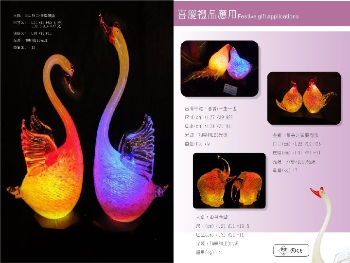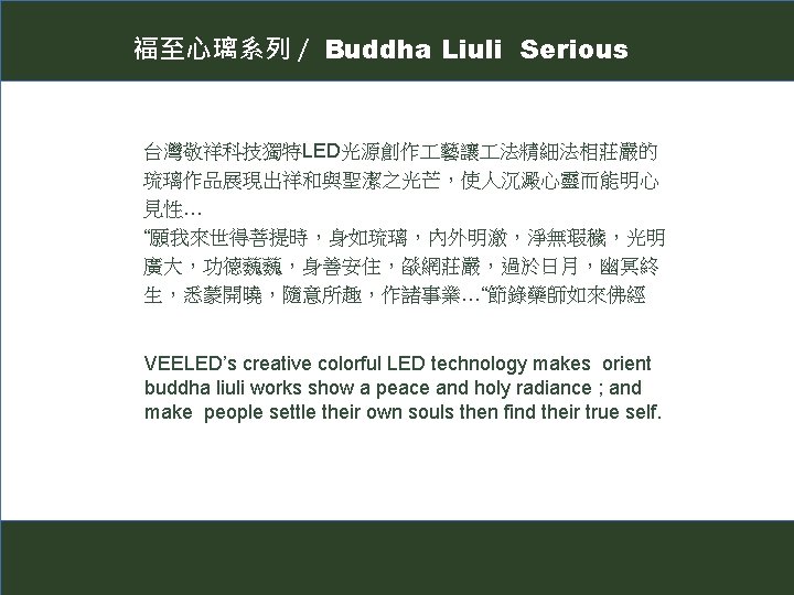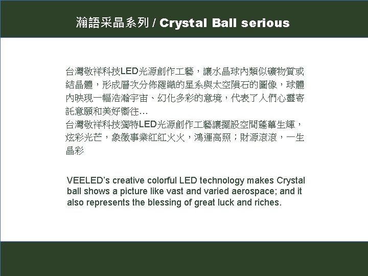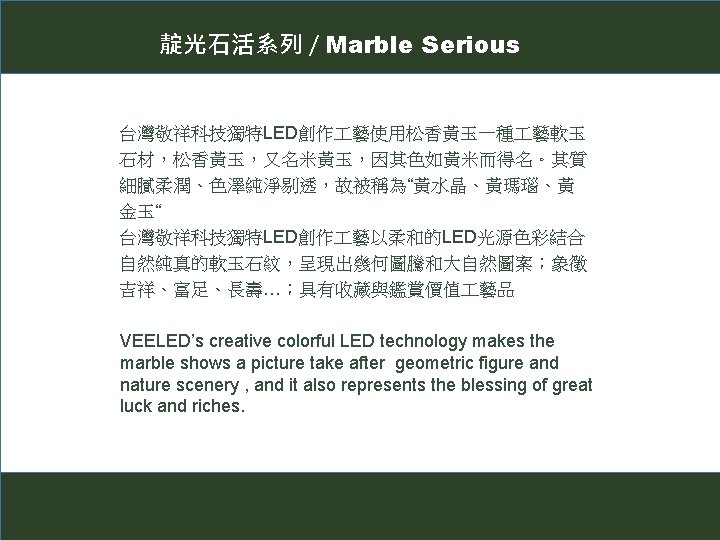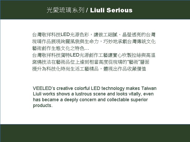 臺灣敬祥科技成立於 2004年, 在擁有自主研發團隊 Taiwan VEELED Incorporation was founded in 的優勢利基下,研發了多國專利的創意LED綠能情境 2004. we researched and developed our patents 光源,讓原本的靜態 藝與藝術品材料,展現出另一 for many countries by our own R&D team and our 種獨特、煥然一新的風貌與活力…相關�品並已通過 products were ISO 9001: 2008 & Ro. HS listed. ISO 9001: 2008 &Ro. HS認證。 經過團隊不斷的努力 與堅持, 讓世人期待已久的品牌”瑤光創藝”終於在 2011年…誕生。 In recent years, high tech products combined arts has become a trend in international market. Taiwan VEELED’s creative and green light source make 近來國際市場掀起科技�品與時尚精品的結合風潮; many precious and rare static materials showing their 期許不久的將來能成為LED科技業界的文創精品領導 unique , new looks and activities. Now, Taiwan 品牌, 以獨特的LED光源科技結合;台灣在地及更多 VEELED’s creative LED products has become a 樣化的 藝材料與藝術精品, ”瑤光創藝”將會傳遞更多 deeply concern and collectable superior products. 溫馨、喜悅與希望的氣息…!