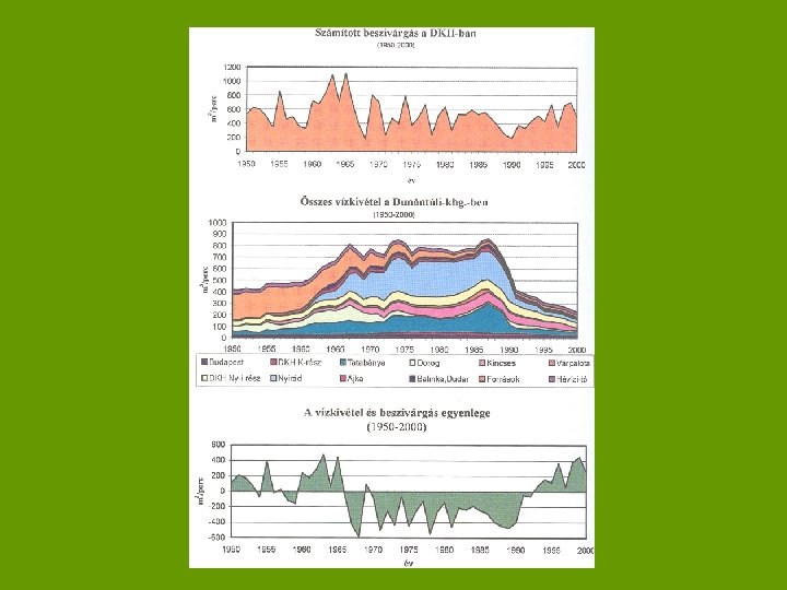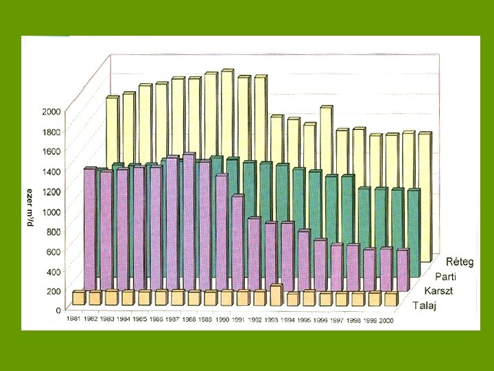 Talajvíz csökkenés • Körös – Maros NP • Kiskunsági NP • Eredeti erdőtársulások rekonstruálása nehéz • Szigetköz • Taljvízcsökkenés okai: folyószabályozás, belvízlevezetés, ivóvíz kitermelés, intenzív öntözés, erdőtelepítések Karsztvíz • Nyírád 60 – 100 m depresszió • Eocén program – bauxit bányászat • Dunántúli középhegység • Hévizi – tó, Tapolcai tavas barlang vízszintcsökkenése • ’ 90 – es évek óta növekszik a kartszvízszint