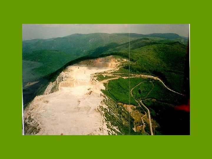 Felszíni bányászat Kőbányászat: • Minőségi terméskő • Terméskő • Ipari nyersanyag Badacsony, Pálháza, Bélapátfalva, Szársomlyó (értékes sziklagyepek, magyar kikerics), Felsőtárkány, Berva-völgy, Esztramos (barlangok pusztulása, károsodása) Felszíni lignitbányászat Visonta, Bükkábrány (medencék feltöltése, talajvízszint süllyedés) Mészkőbányák esetében a tájképi kár nagyobb Illegális hulladéklerakás