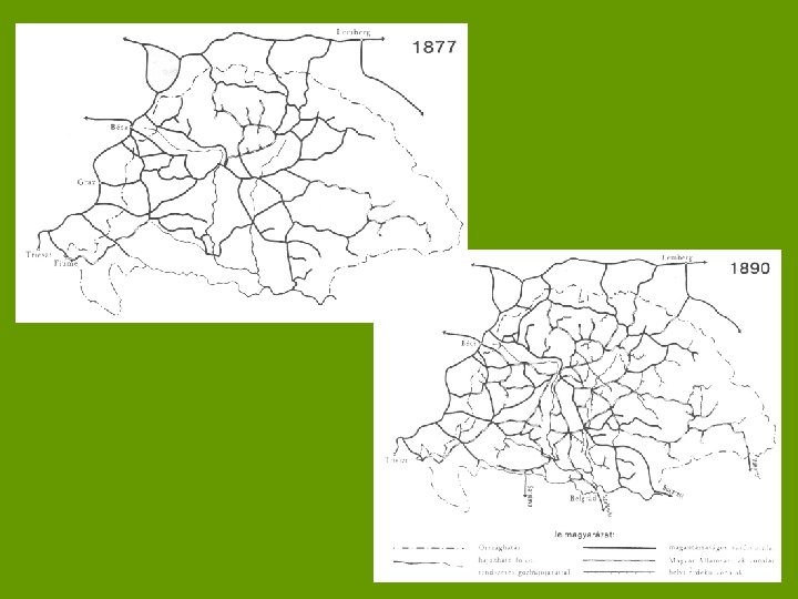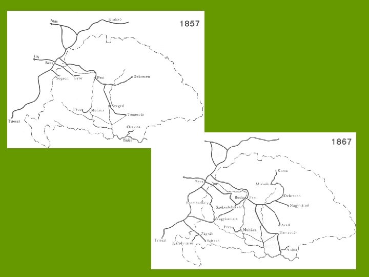 Vasútépítés • A vasútépítés a Kárpát-medence földrajzi-gazdasági képét alapvetően megváltoztatta • Pest – Vác szakasz 1846, Pest – Szolnok 1847 • 1867 -73 között 4100 km új vasútvonal épült • Erősen centralizált hálózat alakult ki