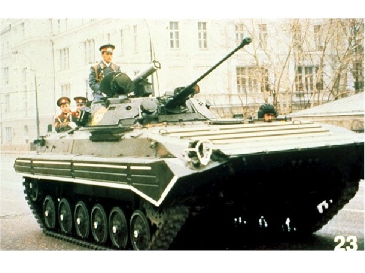 BMP 2 • Crew 3 + 7 • Armamament 30 mm cannon 1 x 7. 62 mm machine gun Spandrel ATGW launcher 2 x 3 smoke dischargers • Ammunition 500 x 30 mm 2, 000 x 7. 62 mm 4 Spandrel ATGW • Length 6. 735 m Width 3. 15 m Height 2. 45 m Weight 14, 300 kg • Engine Model UTD-20 6 -cylinder diesel developing 285/300 hp at 2, 600 rpm • Max Road Speed 65 kmh • Gradient 60% Side Slope 40% • Fuel Capacity 462 lit Max Range 600 km • Fording Amphibious Verticle Obstacle 0. 7 m Trench 2. 5 m • Armor Steel • NBC System Yes • Night Vision Equipment Yes
