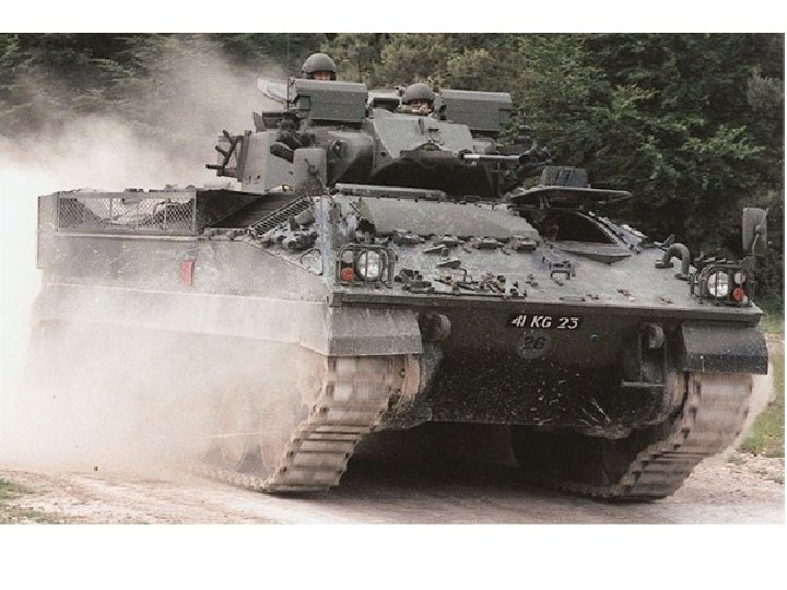 Warrior • Crew 3 + 7 • Armamament 30 mm cannon 7. 62 mm machine gun 2 x 4 smoke dischargers • Ammunition • Length 6. 34 m Width 3. 034 m Height 2. 791 m Weight 24, 500 kg • Engine Perkins CV 8 TCA V-8 diesel developing 550 hp at 2, 300 rpm • Max Road Speed 75 kph • Gradient 60% Side Slope 40% • Fuel Capacity 770 lit Max Range 660 km • Fording 1. 3 m Verticle Obstacle 0. 75 m Trench 2. 5 m • Armor Classified • NBC System Yes • Night Vision Equipment Yes (passive)