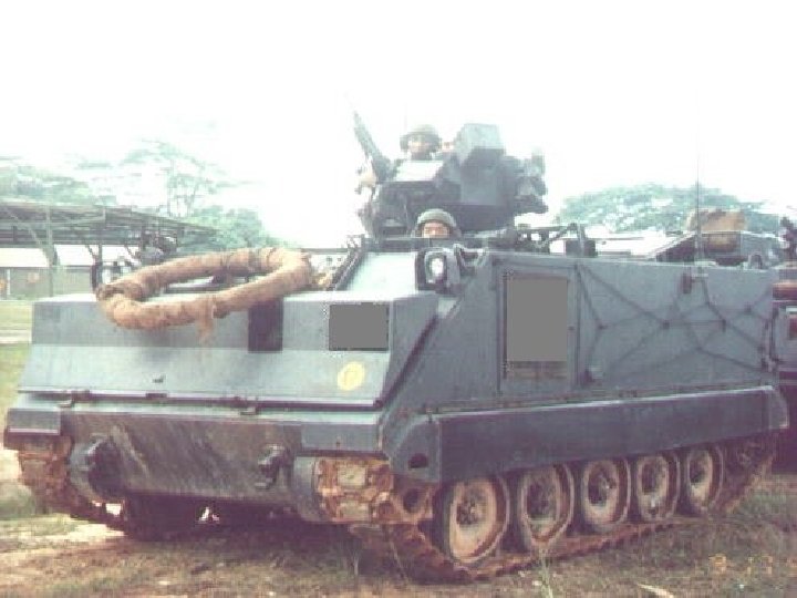 M 113 APC • Crew 2+11 Armamament 1 x 12. 7 mm • Ammunition 2000 x 12. 7 mm • Length 4. 863 m • Engine Detriot diesel model 6 V-53, 6 cylinder water cooled diesel developing 215 bhp at 2800 rpm • Max Road Speed 67 kmh • Gradient 60% Side Slope 40% • Fuel Capacity 360 lit Max Range 483 km • Fording amphibious • Verticle Obstacle 0. 61 m Trench 1. 68 m • Armor 38 mm - Aluminum • NBC System • Optional Night Vision Equipment Yes(passive or infra red - driver) Width 2. 686 m Height 1. 85 m Weight 11, 341 kg