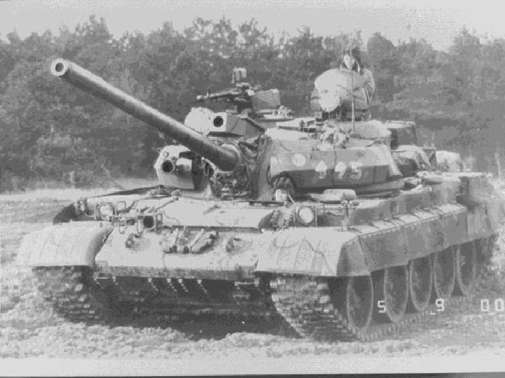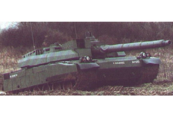 KEY RECOGNITION FEATURES • • • Vehicle Hull: well-sloped glacis plate with driver’s position top center, distinctive V splash plate on glacis, turret center of hull, engine and transmission rear. Unlike T-72, no exhaust outlet on left side of hull. Turret: Circular turret, raised cupola with 12. 7 mm MG on right of roof, two stowage boxes right side of turret and one on turret rear (above which is the snorkel), three MG ammunition boxes on left side of turret. Infrared searchlight to left of 125 mm gun with thermal sleeve and fume extractor. Suspension: each side has six-road wheels (much smaller than those do on T 72) drive sprocket rear, idler front and four track-return rollers. Side skirts or grills type armor panels often installed over upper part of suspension. Unditching beam and fuel drums often carried rear.