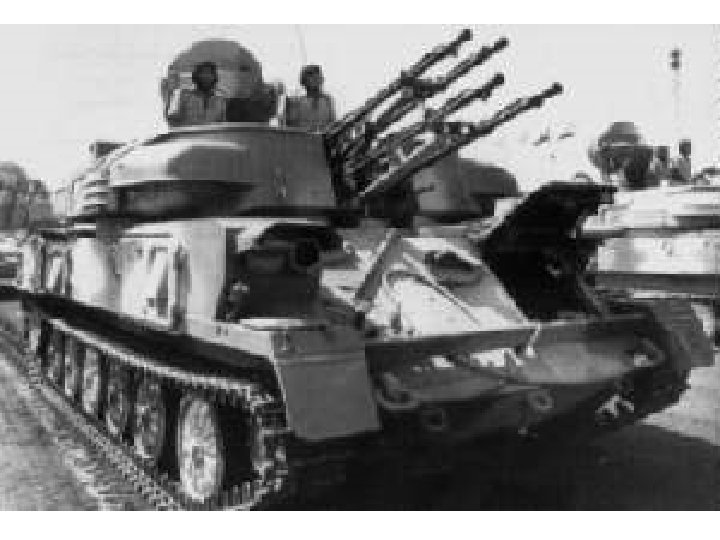 ZSU 23 -4 • Crew 4 • Armamament 4 x 23 mm cannon • Ammunition 2, 000 x 23 mm • Length 6. 54 m Width 2. 95 m Height 2. 25 m Weight 20, 500 kg • Engine Model V-6 R, 6 -cylinder in line water cooled diesel developing 280 hp • Max Road Speed 44 kmh • Gradient 60% Side Slope 30% • Fuel Capacity 250 lit Max Range 450 km • Fording 1. 07 m Verticle Obstacle 1. 1 m Trench 2. 8 m • Armor Steel (15 mm - max) • NBC System Yes • Night Vision Equipment Yes(driver only)