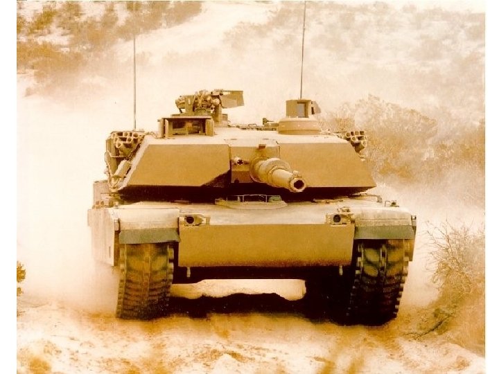 M 1 Abrams Main Battle Tank • Crew 4 • Armamament 120 mm main gun 7. 62 mm coaxial machine gun 7. 62 mm anti-aircraft machine gun. 50 cal(12. 7 mm) AA MG 2 x 6 smoke dischargers • Ammunition 40 x 120 mm 1, 000 x. 50 cal 11, 400 x 7. 62 mm 24 x smoke grenades • Length 7. 918 m Width 3. 653 m Height 2. 375 m Weight 68 tons • Engine Textron Lycoming AGT 1500 gas turbine developing 1, 500 hp at 3, 000 rpm • Max Road Speed 72 kph • Gradient 60% Side Slope 40% • Fuel Capacity 505. 3 gal Max Range 498 km Fording 1. 2 m • Verticle Obstacle 1. 2 m Trench 2. 7 m • Armor Classified • NBC System Yes • Night Vision Equipment Yes