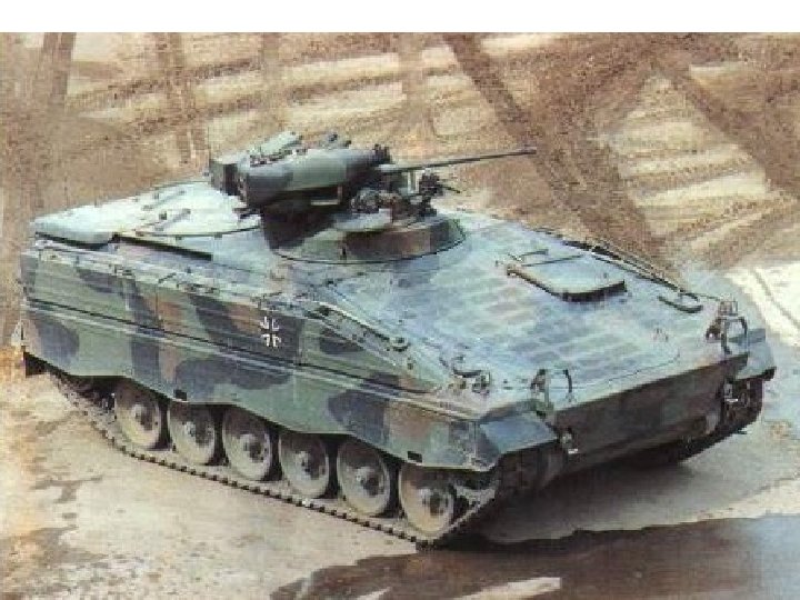 Marder • Crew 3 + 6 • Armamament 1 x 20 mm 1 x 7. 62 mm machine gun coaxial 1 x 6 smoke dischargers • Ammunition 1250 x 20 mm 5, 000 x 7. 62 mm • Length 6. 79 m Width 3. 24 m Height 1. 9 m Weight 29, 200 kg • Engine MTU MB 833 Ea-500, 6 cylinder liquid cooled diesel developing 600 hp at 2, 200 rpm • Max Road Speed 75 kmh • Gradient 60% Side Slope 30% • Fuel Capacity 652 lit Max Range 520 km • Fording 1. 5 m 2 m w/prep Verticle Obstacle 1 m Trench 2. 5 m • Armor Classified • NBC System Yes • Night Vision Equipment Yes - infra red