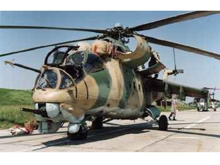 MI-24 HIND • • • PERFORMANCE Vmax 208 mph (335 km/h) Range 310 miles Dynamic / static ceiling 14 100 / 2 300 ft POWER PLANT 2 x TV 3 -117 turboshafts Power 1640 k. W each CREW 3 men -Pilot - Helicopter Commander -Pilot - Operator -Flight Engineer