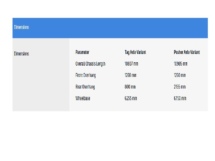 7. Wheel and Tyres-10 R 20 - 16 PR Wheel Rims Optional I : 7. 50 X 20 Optional II : 7. 50 V X 20 Tubeless Radial Tyre option on Front, Lift Axle & Spare Tyres-295/80 R 22. 5 Wheel Rim-8. 25 X 22. 5 8. Brakes Type-ABS Brake Drum Diameter-410 mm Auxiliary Braking System-Engine Exhaust Brake 9. Steering Description Hydraulic Power Steering