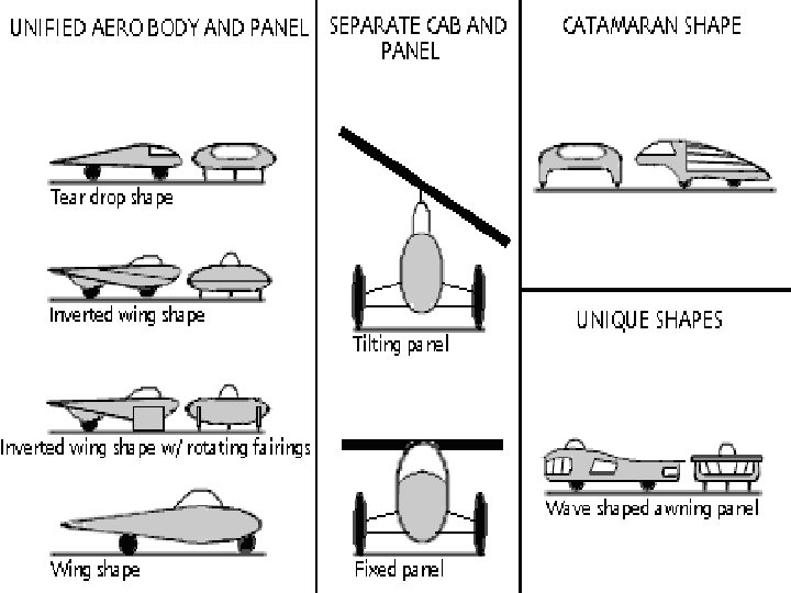 Ø Body Shapes • • Unified aero body and panel Fixed or tilting, flat panels with a separate driver cab Catamaran shape uniquely designed shape Ø MAIZE & BLUE and SUNRUNNER are catamaran shaped.