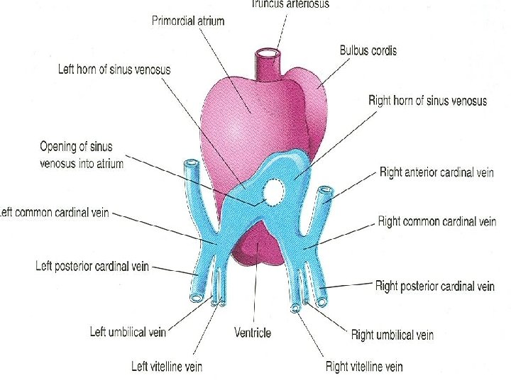 Cardinal Veins Ø During the eighth week the anterior cardinal veins become connected by an anastomosis Ø This anastomosis shunts blood from the left to the right anterior cardinal vein Ø This shunt becomes the left brachiocephalic vein when the caudal part of the left anterior cardinal vein degenerates Ø Superior vena cava forms from the right anterior cardinal vein and the right common cardinal vein