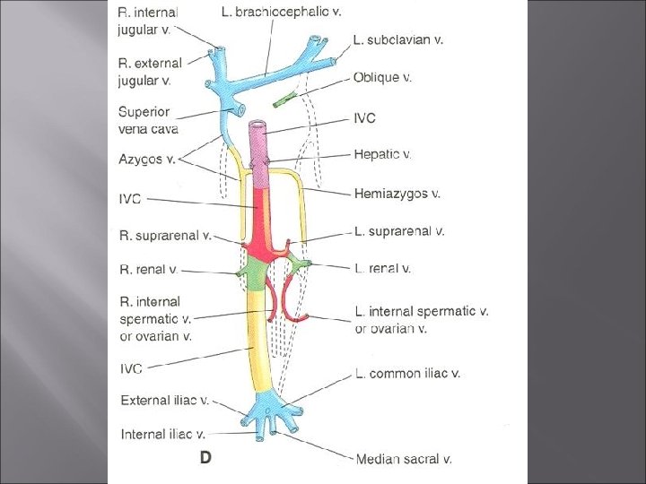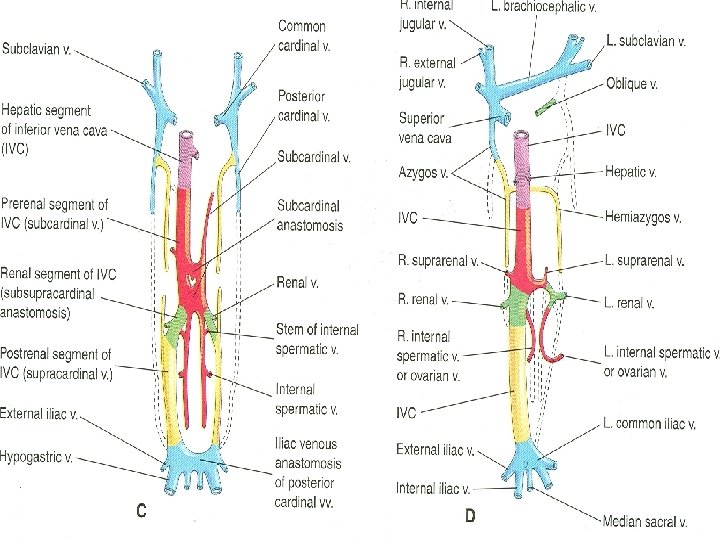 Inferior Vena Cava Ø A hepatic segment derived from the hepatic vein (proximal part of right vitelline vein) and hepatic sinusoids Ø A prerenal segment derived from the right subcardinal vein Ø A renal segment derived from the subcardinal supracardinal anastomosis Ø A postrenal segment derived from the right supracardinal vein