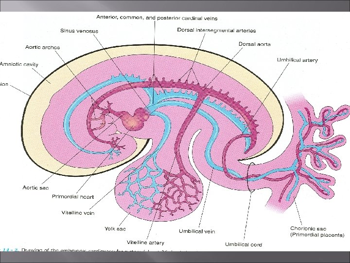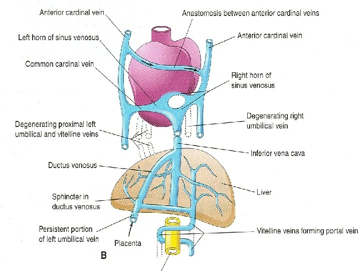 Umbilical Veins Ø The umbilical veins run on each side of the liver and carry well-oxygenated blood from the placenta to the sinus venosus Ø As the liver develops the umbilical veins lose their connection with the heart and empty into the liver Ø The right umbilical vein disappears during the 7 th week Ø Now the left umbilical vein is the only vessel carrying well-oxygenated blood from the placenta to the embryo
