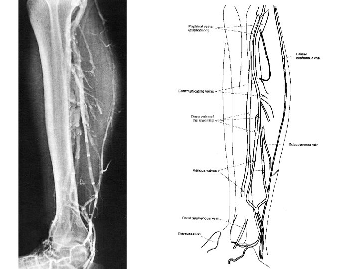 Vv. digitales dorsales – vv. metatarseae dorsales – rete venosum dorsale pedis, rete venosum plantare pedis – vv. intercapitulares v. marginalis med. – v. saphena magna v. marginalis lat. – v. saphena parva (v. femoropoplitea)