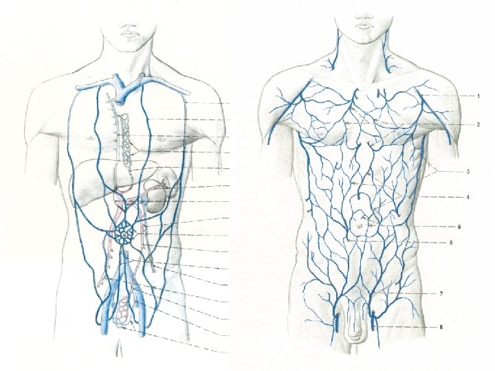 V. CAVA INF. - v. iliaca communis dx. et sin. - vv. lumbales - vv. phrenicae inf. - v. sacralis mediana - v. testicularis dx. (- v. ovarica dx. ) - vv. renales - v. suprarenalis dx. - vv. hepaticae