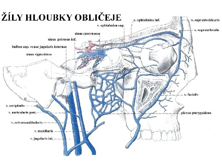 V. RETROMANDIBULARIS - v. temporalis spf. - v. maxillaris - v. temporalis media - v. transversa faciei V. FACIALIS - v. angularis - v. prof. faciei - v. palatina ext.