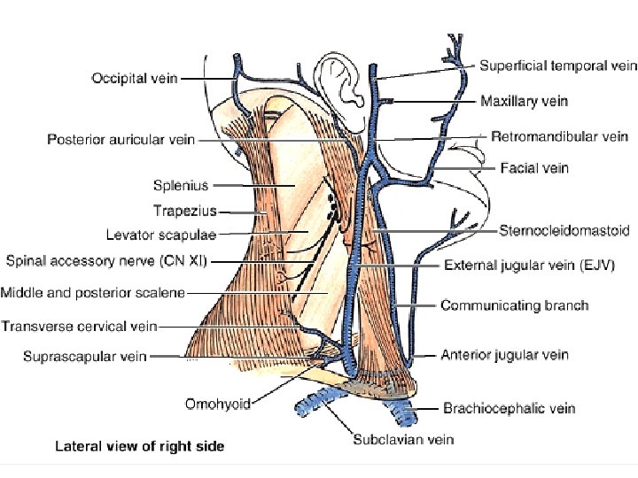 Tributaries of vena jugularis interna 6. superficial veins of neck between platysma and lamina superficialis fasciae cervicalis • v. jugularis externa – v. auricularis post. – posterior division of v. retromandibularis – end: angulus venosus • v. jugularis anterior – tributary of superficial submandibular veins – arcus venosus jugularis (! tracheotomia inferior !) – end: v. jugularis ext. alternating termination into area of angulus venosus !