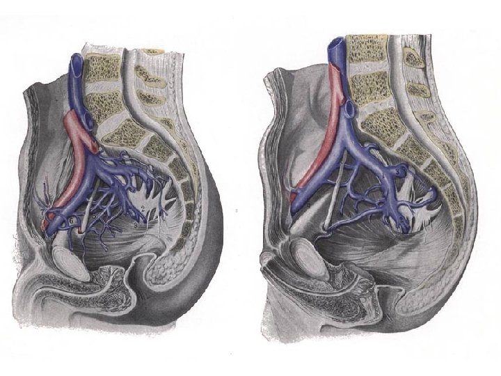 Vena iliaca interna – pelvic veins • parietal: correspond to arteries • visceral: plexuses – plexus venosus pudendus (Santorini) • within spatium retropubicum (Retzii) – p. v. vesicalis + prostaticus – p. v. uterinus + vaginalis (uterovaginalis) – p. v. rectalis • p. v. rectalis externus (within tunica adventitia) • p. v. rectalis internus = p. haemorrhoidalis (within tunica submucosa) – p. v. sacralis (interconnected with vv. sacrales lat. + mediana)