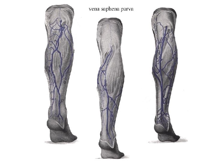 Vena saphena parva • valvula terminalis + preterminalis • v. s. p. accessoria superficialis • extensio cranialis venae saphenae parvae (obsolete „v. femoropoplitea) • runs with n. suralis venae intersaphenae