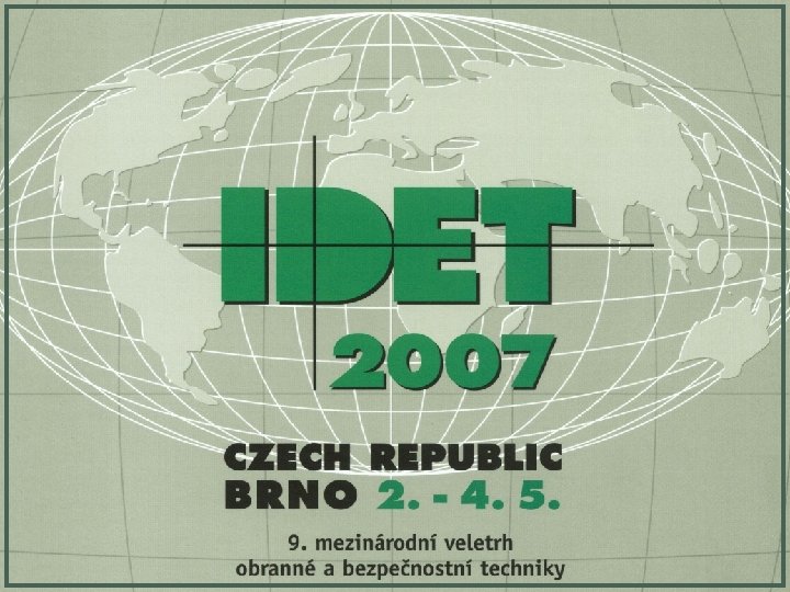 Veletrh IDET 2007 Doprovodné programy: 1) Konference CATE (community, army, technology, environment) Rozsah konference: Ø Vojenské technologie 2007, mezinárodní vědecká konference, Ø Simulace a distanční vzdělávání, vědecko-odborná konference, Ø 8. sympozium o zbraňových systémech, Ø Bezpečnost a ochrana informací 2007 - vědecká konference, Ø Materiály a technologie ve výrobě speciální techniky, Ø Ekonomika, logistika a ekologie v ozbrojených silách, mezinárodní konference, Ø Společenskovědní a sociální kultivace vojenských profesionálů, mezinárodní konference, (očekávaná účast 700 – 750 osob) 2) Dynamický polygon - předvádění technických vlastností kolových vozidel