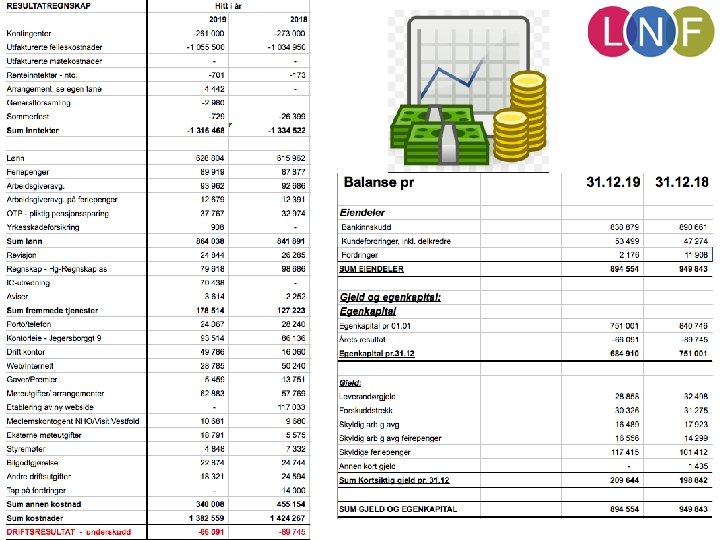Styret har vært sammensatt slik: Anders Villum Advokat Signe Stenersen Sparebank 1 Siv Hjertø Velle Gruppen Jonas Löthman Larvik Golfklubb Hege Lundhs Thor-Inge Karlsen Lett-Tak Torgeir Herlofsen (møtende varamedl. ) ASKO Stian Tvetene (møtende varamedl. ) Treschow-Fritzøe Tore Hansen er ansatt som foreningens daglige leder. Regnskapsfunksjonen ivaretas av HG Regnskap AS. Det er avholdt 8 ordinære styremøter og 1 strategisamling i løpet av året. Medlemsmassen har vært stabil på i underkant av 200 (representerer ca 370 virksomheter) over flere år. Det er innmeldt 11 nye medlemmer gjennom året. 11 er strøket pga manglende betaling av kontingent eller utmeldt av andre årsaker. Det er avholdt 14 arrangementer i løpet av året – tematiske, faglige og sosiale. Den tyngste og mest medieomtalte saken i 2019 har utvilsomt vært valg av trasé- og stasjonsplassering for ny to-spors jernbane. Saken berører mange av våre medlemsbedrifter direkte og mange indirekte. Styret valgte i januar/februar å benytte City. Plan til en faglig gjennomgang av Bane. NORs anbefalte løsning som grunnlag for vår høringsuttalelse. Dette var et omfattende materiale, og belastet 2019 -regnskapet ekstraordinært med kr 70. 438, -. Regnskapet er således gjort opp med et underskudd på kr 66. 091, -. Foreningens økonomi og likviditet er fortsatt god med en egenkapital på kr 684. 911, -.