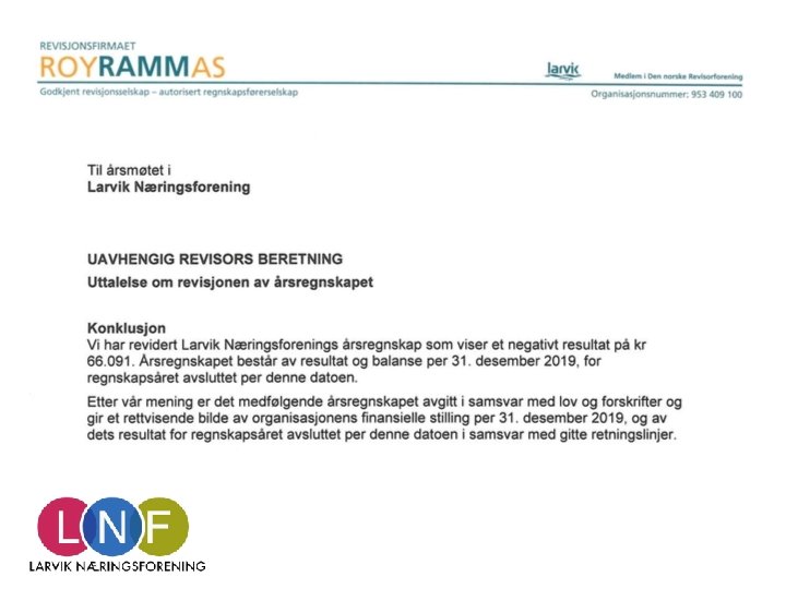 Det må fortsatt mobiliseres for at våre politikere skal gi oss konkurransedyktige, forutsigbare og gode rammebetingelser slik at etablert næringsliv og nye investorer skal tørre å satse i Larvik. Inntil det er tatt en endelig beslutning om trasé- og stasjonsplassering og gjennomføring, vil store områder være båndlagte. Det er ikke et godt utgangspunkt for vekst og utvikling, og en avgjørelse her vil, uansett utfall, få stor betydning for Larviks framtidige utvikling. For igjen å få en bredere bakgrunn for å fokusere på det som er aktuelt og viktig for medlemmene, vil vi også i 2020 gjennomføre en medlemsundersøkelse / ”quest-back”. Arbeidslivskriminalitet er fortsatt et fokusområde, og vi deltar på to arenaer i Vestfold, og nå etter hvert Vestfold og Telemark, for å løfte dette viktige temaet med flere samarbeidspartnere på området. Årets sommerarrangement for Vestfolds næringsliv blir i 2020 lagt til Foyn-haven, og vi er allerede godt i gang med planleggingen av dette. Larvik skal i 2021 markere sine 350 år, og LNF er invitert inn og deltar i både styrings- og prosjektgruppa for jubiléet. Vi takker alle som har bidratt i 2019 for innsatsen og satser videre inn i 2020.