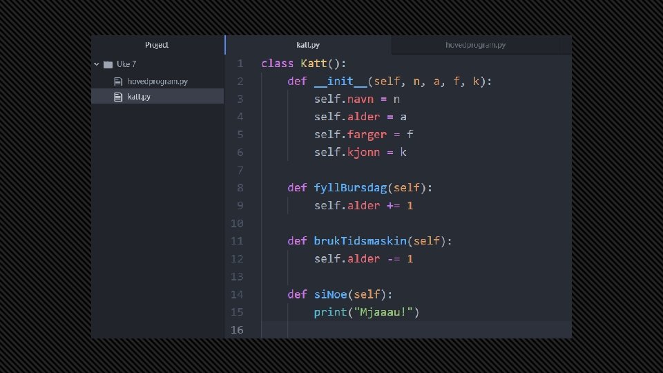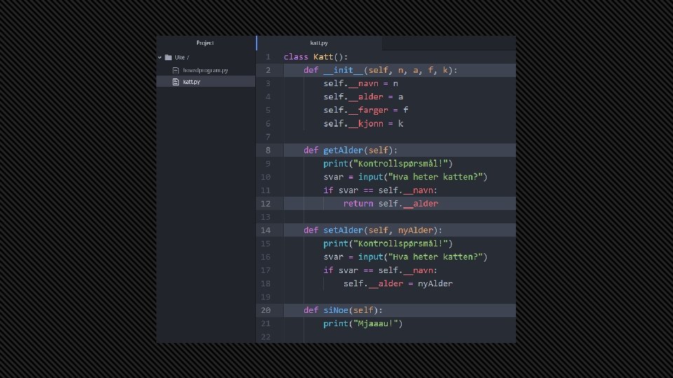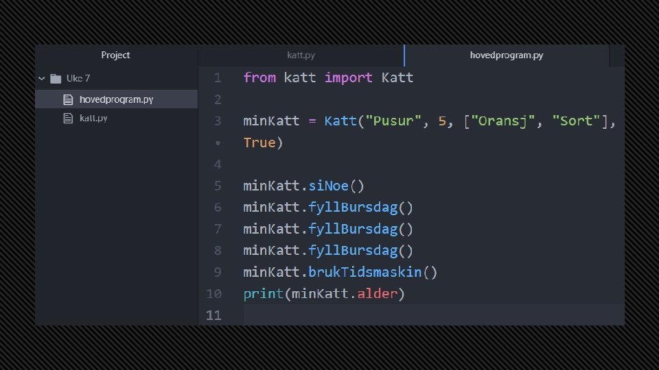 Syntaks for å opprette objekter Legg merke til at objektet opprettes i en egen fil Legg merke til at vi importerer klassen Katt fra filen katt Legg merke til at filen som oppretter klassen og filen som oppretter objekter ligger i samme mappe Her kan vi aksessere og endre instansvariablene Her kan vi aksessere og bruke instansmetodene