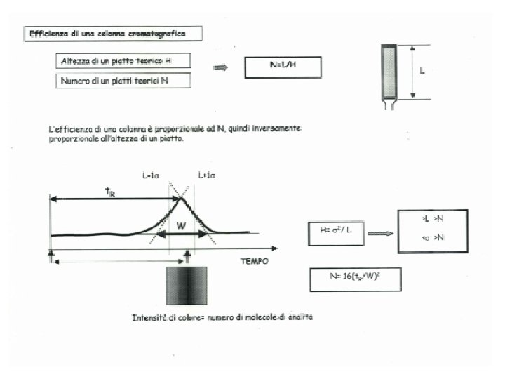Efficienza della colonna cromatografica N=L/H N è il numero dei piatti terorici L è la lunghezza geometrica della colonna H è l’altezza del piatto teorico L’efficienza aumenta all’aumentare del numero dei piatti, ovvero aumenta all’aumentare di L e diminuisce all’aumentare di H N varia grandemente sia in funzione della composizione chimica della FM che della composizione chimica e FISICA della FS Ad esempio: 0, 1 cm <H< 10 -6 cm
