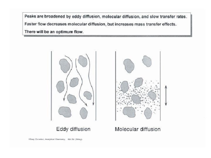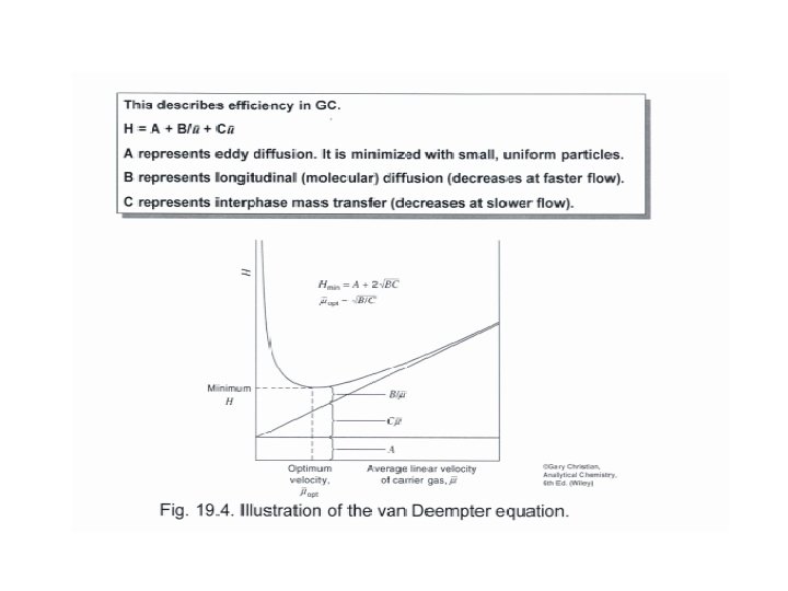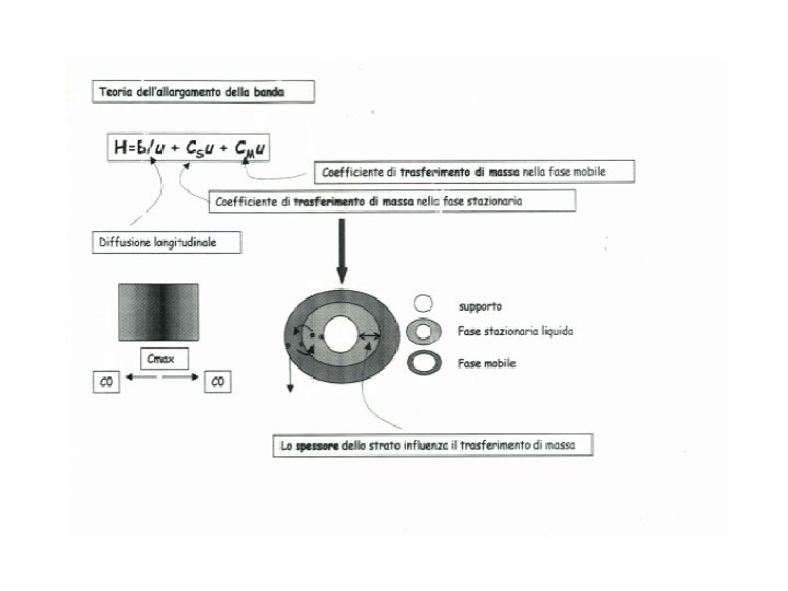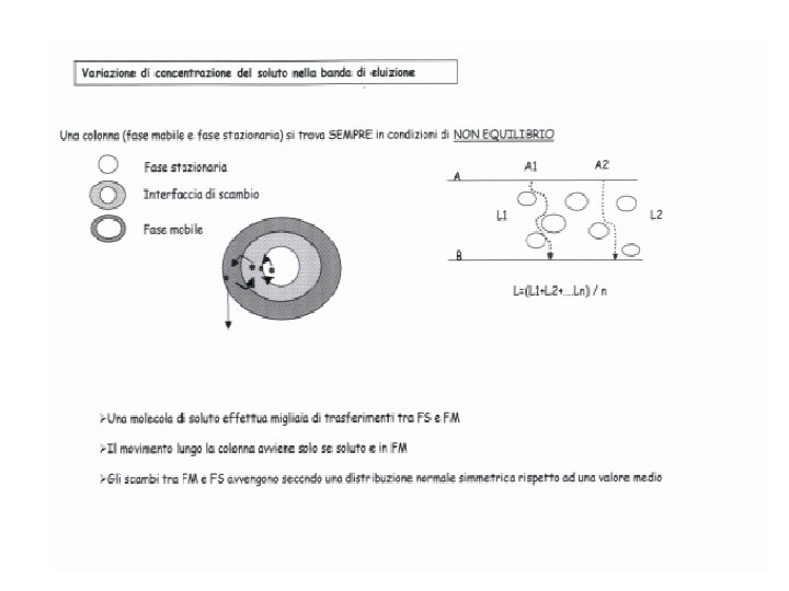 ALTEZZA DEL PIATTO (H) Come misura dell’altezza del piatto si usa il quadrato della varianza per unità di lunghezza della colonna H=s 2/L In termini qualitativi l’altezza del piatto può considerarsi come la porzione di colonna che contiene una frazione di analita compresa tra L e L-s. Dato che l’area della gaussiana (picco compresa tra L-s e L+s contiene il 68% dell’analita, la porzione compresa tra L e L-s contiene il 34% dell’analita. Quindi H può essere definita come la porzione di colonna che contiene il 34% dell’analita)