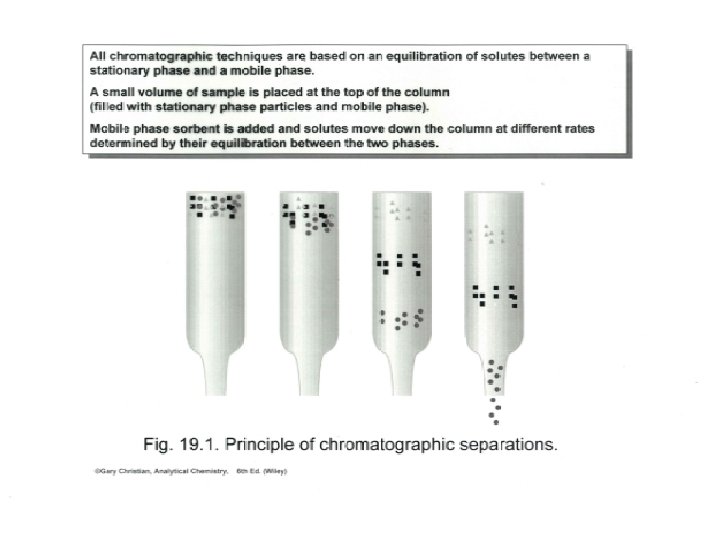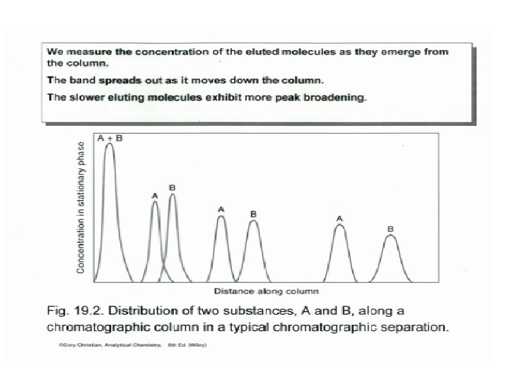 Velocità dei soluti in una separazione cromatografica Il soluto si muove lungo la colonna cromatografica solo quando si trova in fase mobile. Da questo discende che la velocità media con cui il soluto migra dipende dalla frazione di tempo che esso trascorre nella fase mobile. Questa frazione è piccola per soluti che sono fortemente trattenuti dalla fase stazionaria e grande per soluti trattenuti dalla fase mobile. Le differenti velocità fanno si che i soluti si separino in bande lungo la lunghezza della colonna. Il processo di separazione si realizza quindi facendo passare attraverso la colonna una quantità di fase mobile sufficiente per eluire le singole bande dalla colonna e possano essere raccolte (o misurate) in tempi diversi.