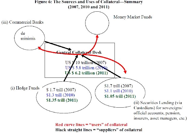 The suppliers of collateral to the ‘street’(or dealers) n The key sources that provide collateral to the street are (a) hedge funds, (b) custodians, generally on behalf of pension, insurers, asset managers, official sector accounts ( SWFs, central banks etc ). n Generally, hedge funds are the largest supplier of collateral to the “street” that intermediates the bank/nonbank nexus. n Others such as pension funds, insurers, official sector accounts generally “lend” their collateral for short tenor to enhance the overall return to their securities.