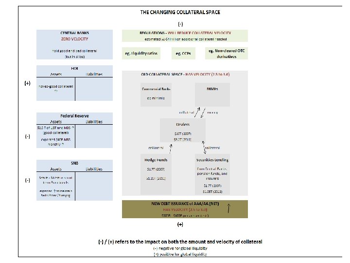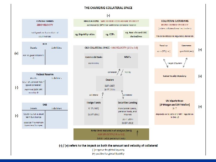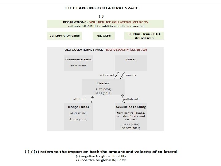 n Custodians, Dealers & Collateral Silo(s) Eurozone had € 14 trillion in collateral– (i) much of it was locked in “depositories" and thus not easily accessible for cross border use or(ii) the asymmetry of demand for collateral in ‘peripheral’ countries relative to ‘core’ countries did not make the € 14 trillion figure meaningful. n However, Euroclear and Clearstream (the key hubs for Eurozone collateral) are working with the local CSDs (or national/central security depositories) to alleviate collateral constraints. The interconnections to the CSDs will be via the Target 2 Securities (T 2 S) system that will provide a single pan. European platform for securities settlement in central bank money. n In the US, JPMorgan and Bo. NY may also improve collateral