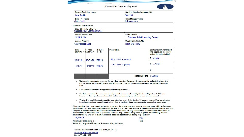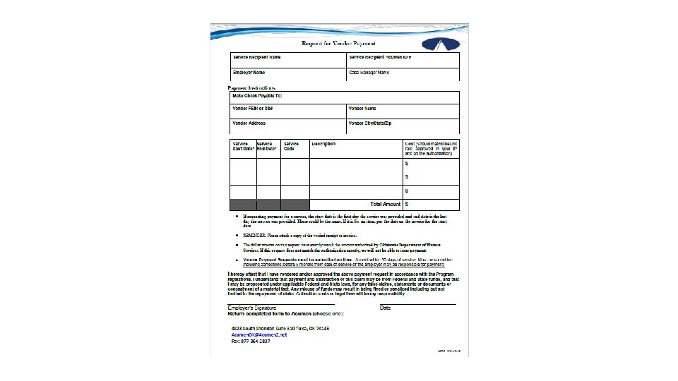 Important Points • Payment cannot be made until a correctly completed form AND invoice or voided receipt are received in addition to having a matching approved authorization. • Must be submitted timely – Submit as soon as possible after the service has been provided but no later five months from the date of when the service was provided. • If a correctly completed form and invoice is not submitted timely, you may be responsible for payment • Cost and Service code on the form must match approved authorization EXACTLY • Only one vendor per form – you can have multiple requests on same form only if they are all to the same vendor
