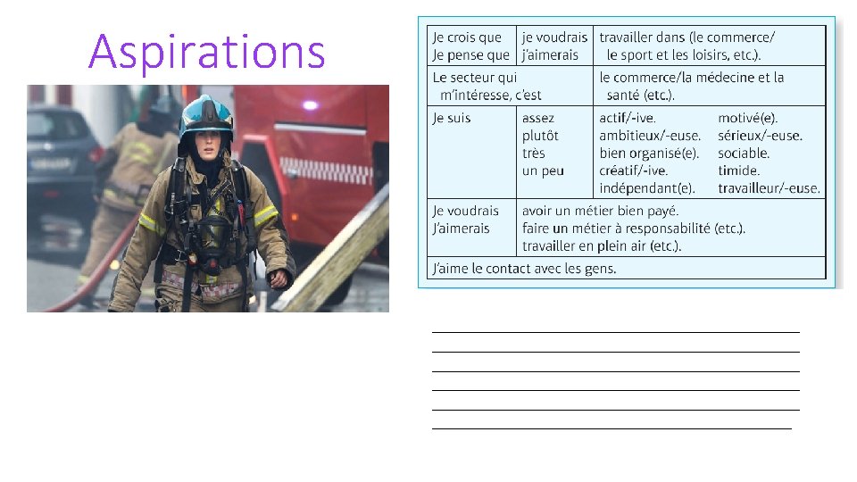 Task 7: 15 minutes Aspirations What would each of these people have said about their future aspirations? Use the blue box for phrases. Je pense que je voudrais être médecin parce que le secteur qui m’intéresse, c’est la médicine. Je suis sociable and bien organisée. Je voudrais travailler en équipe et j’aime le contact avec les gens.